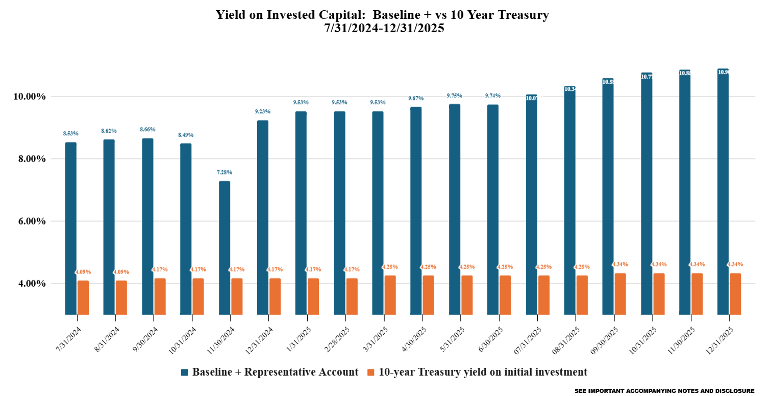 Our Baseline + Asset Management Accounts are actively managed with investing focused on a dividend yield spread over Treasuries and Corporate bonds (the Baseline). Investing primarily in discounted preferred REIT shares and discounted common REIT shares with a goal of capturing capital appreciation (the +).