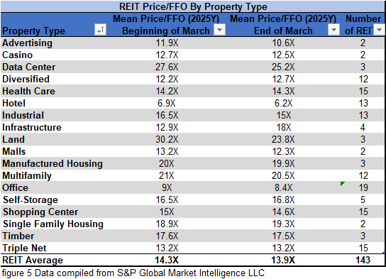 The REIT sector as a whole saw the average P/FFO (2025Y) decrease 0.4 turns in March from 14.3x down to 13.9x. 27.8% of property types averaged multiple expansion, 66.7% averaged multiple contraction and 5.6% saw multiples hold steady in March. Data Centers (25.2x), Land (23.8x), Multifamily (20.5x), Manufactured Housing (19.9x) and Single Family Housing (19.3x) currently trade at the highest average multiples among REIT property types. Hotels (6.2x) and Office (8.4x) are the only property types that average single-digit FFO multiples.