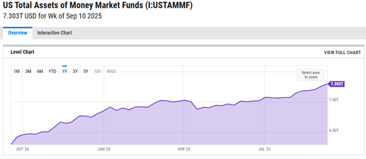 As the chart illustrates, more than $7.3 trillion now sits in US money market funds. The Federal Reserve’s cutting of short-term rates reduces the yield on money market accounts.