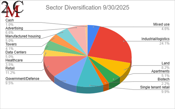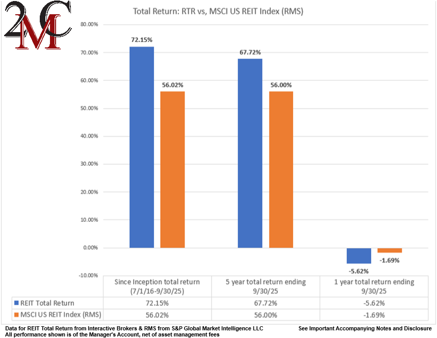 REITs as a sector have had a rough go in the last 6 or so years as the sector slid out of market favor and multiples declined. We try to make the best of a challenging situation and have substantially outperformed the index. RTR’s return since inception (7/1/16 through 9/30/25) is 72.15% compared to the MSCI US REIT index (RMS), which returned 56.02%.