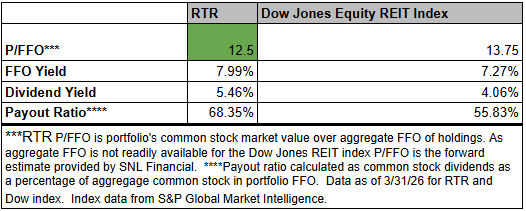 That said, I think it represents opportunity. REITs are trading quite cheaply on both NAV and earnings multiples. Through careful stock selection, we have been able to get even deeper value with an average P/FFO for the RTR portfolio of just 12.5X