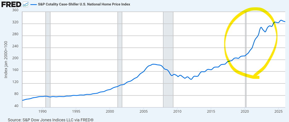 This makes sense logically and plays out in actual data. By far the largest bucket of real estate in the US is single-family homes. Note how home prices soared during the bout of heavy inflation in recent years.